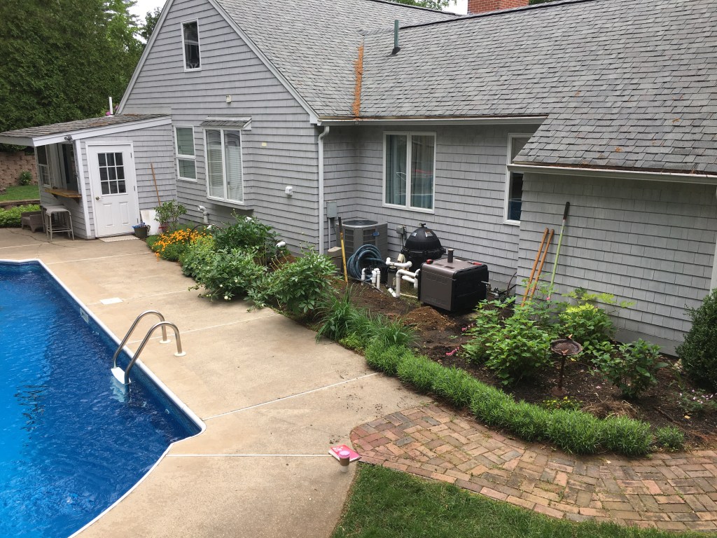 When we arrived at this downtown Newburyport property, the poolside garden was overgrown and uninviting. Shrubs had grown taller than the house in places, blocking views to the backyard and making the space feel cramped. The pool equipment was hidden behind thick plantings, poorly ventilated, and showing signs of mold from restricted airflow. In addition, the dense vegetation made access to the pool area awkward and limited the overall usability of the garden. To restore both function and beauty, we removed the overgrown shrubs and remaining plantings, clearing the area for a complete redesign of the small poolside garden.