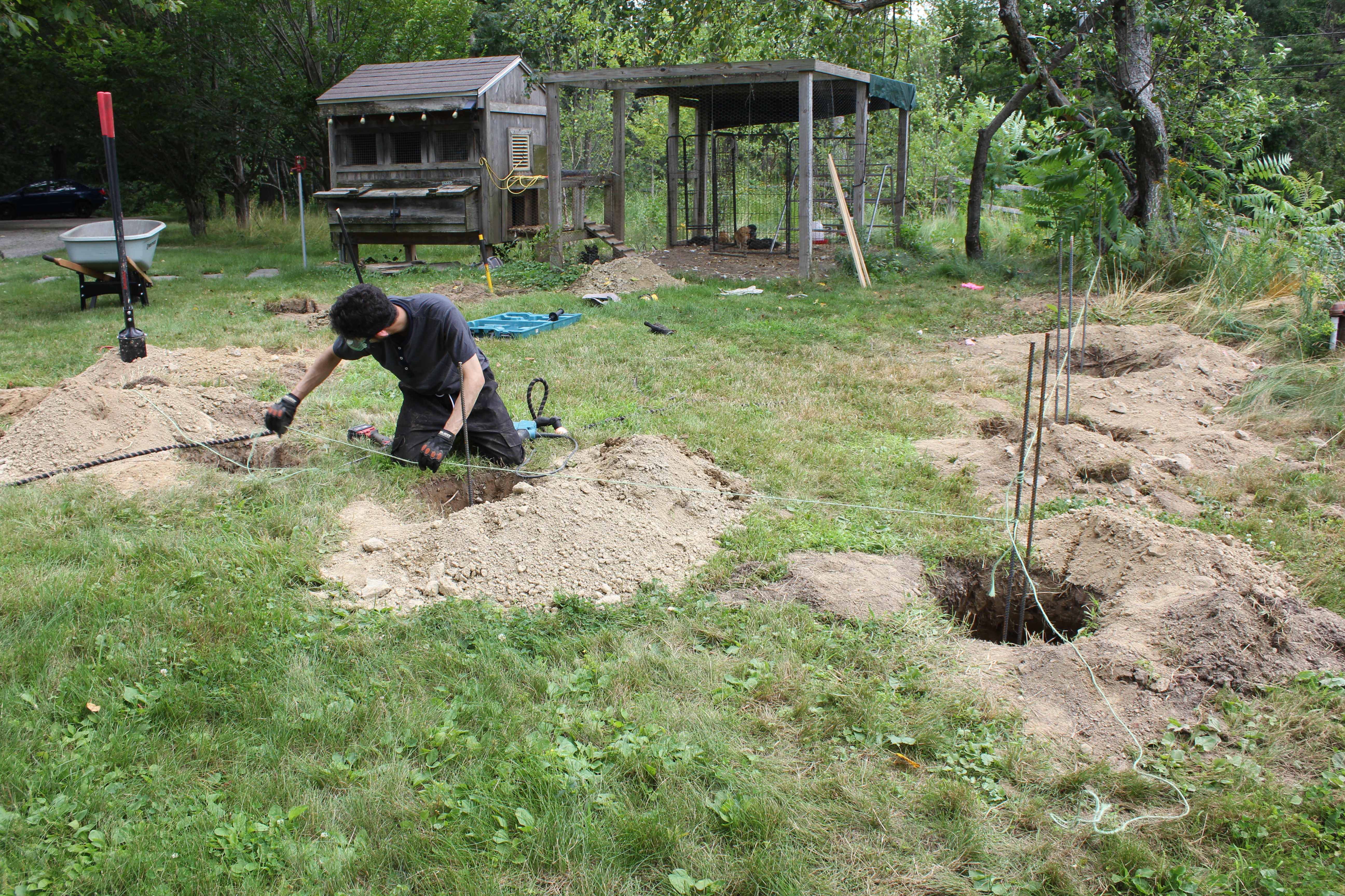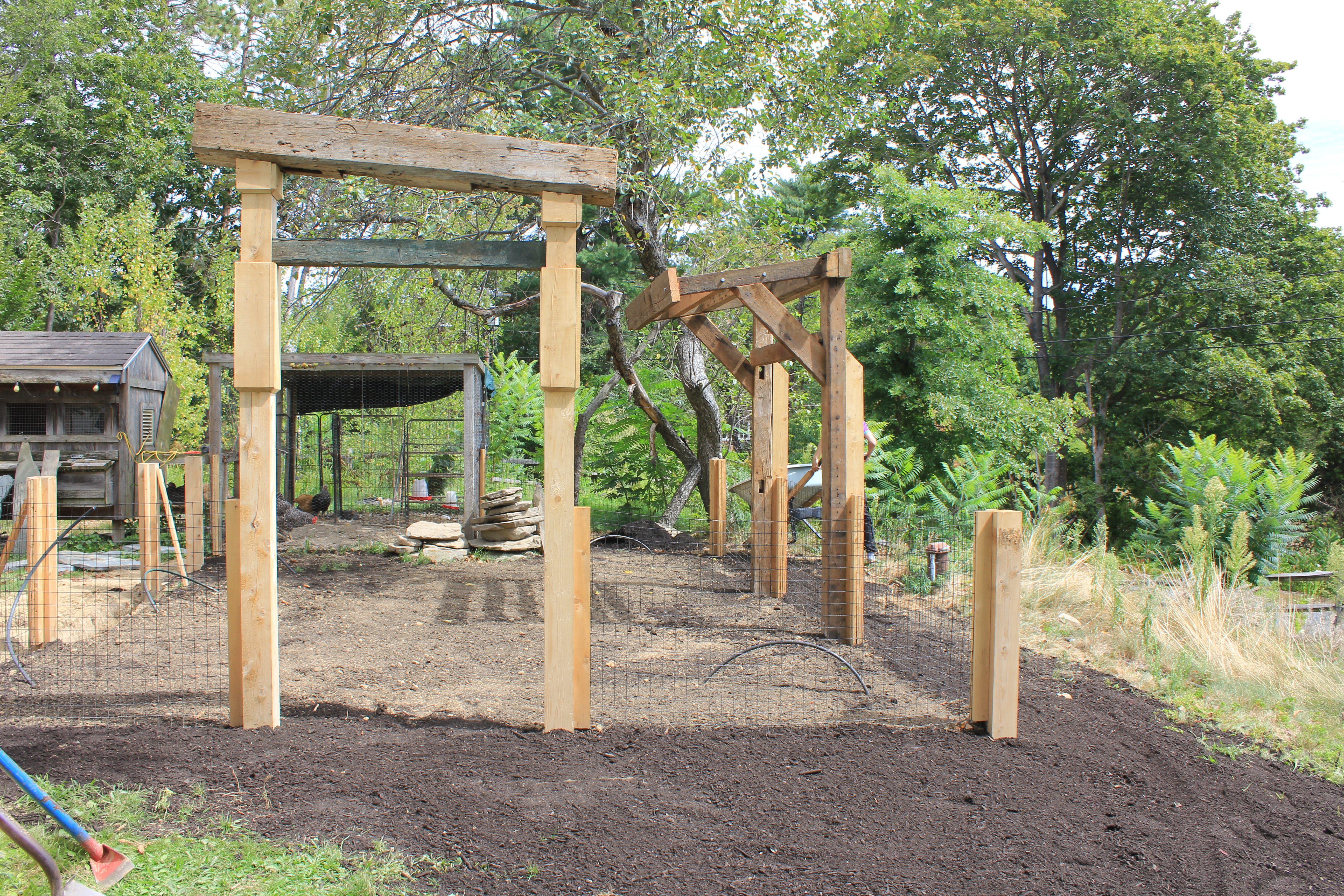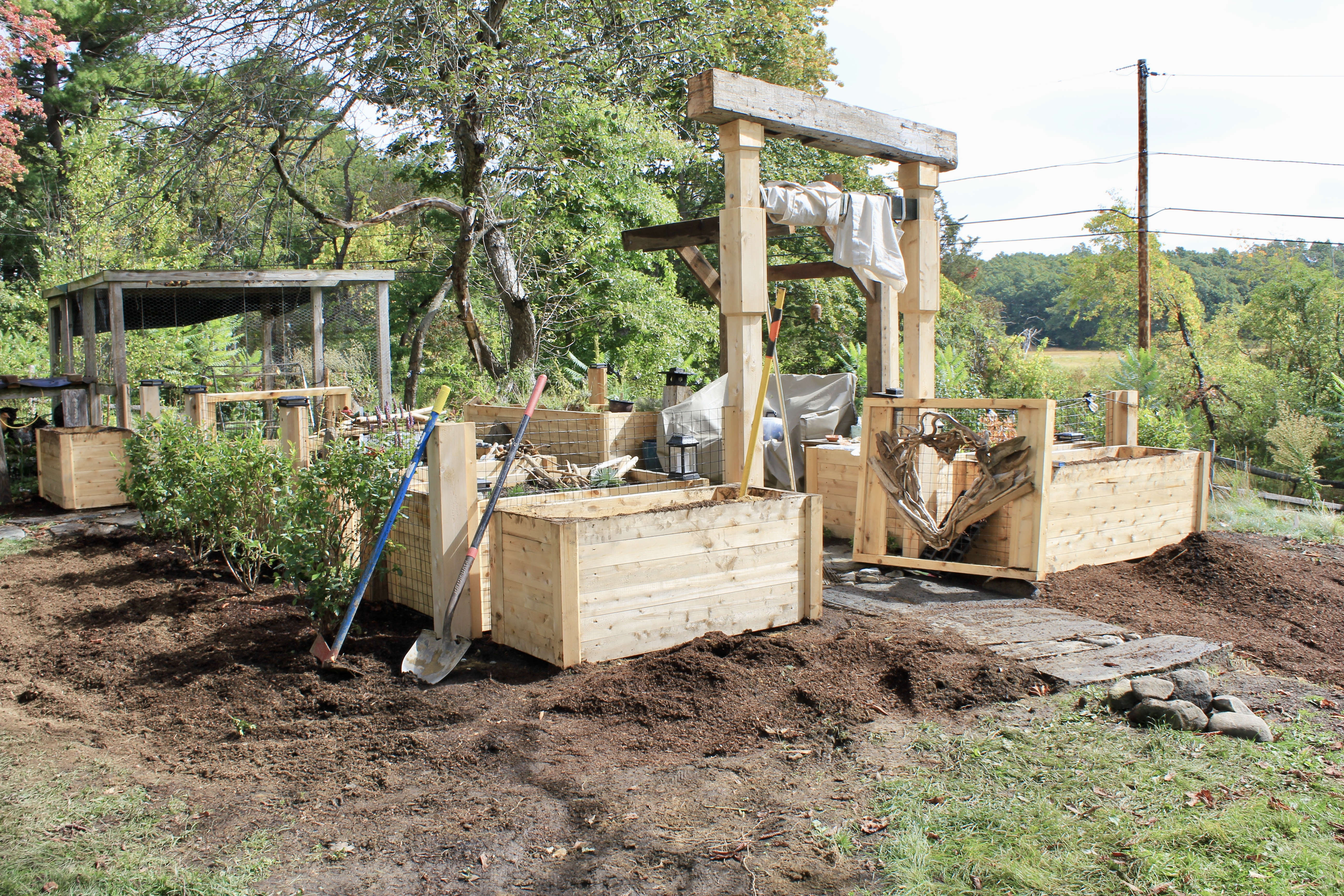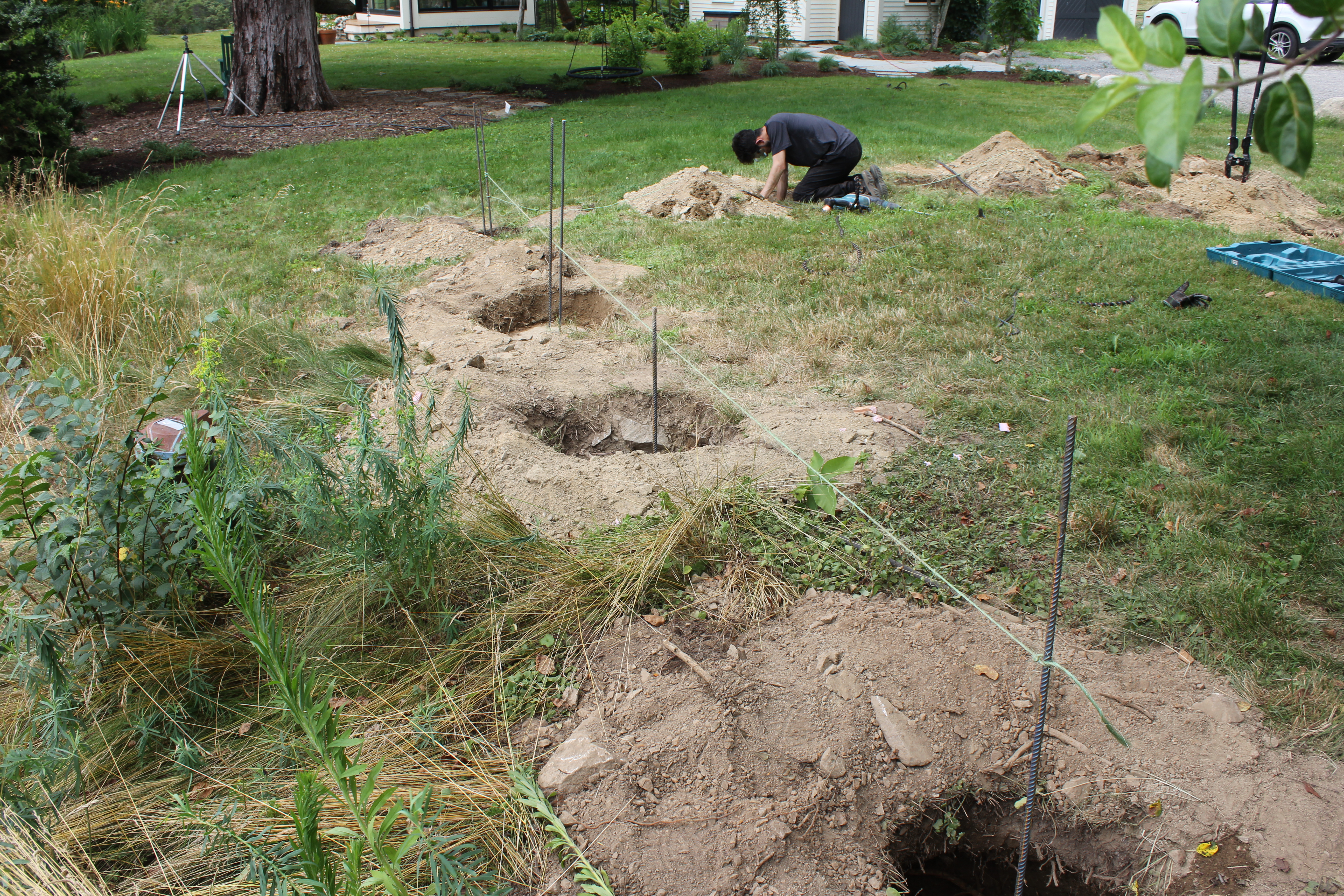 The first step in constructing the vegetable garden was setting the fence line. As we began digging the post holes, it became clear that much of the area sat on shallow ledge — a common challenge in New England landscapes.