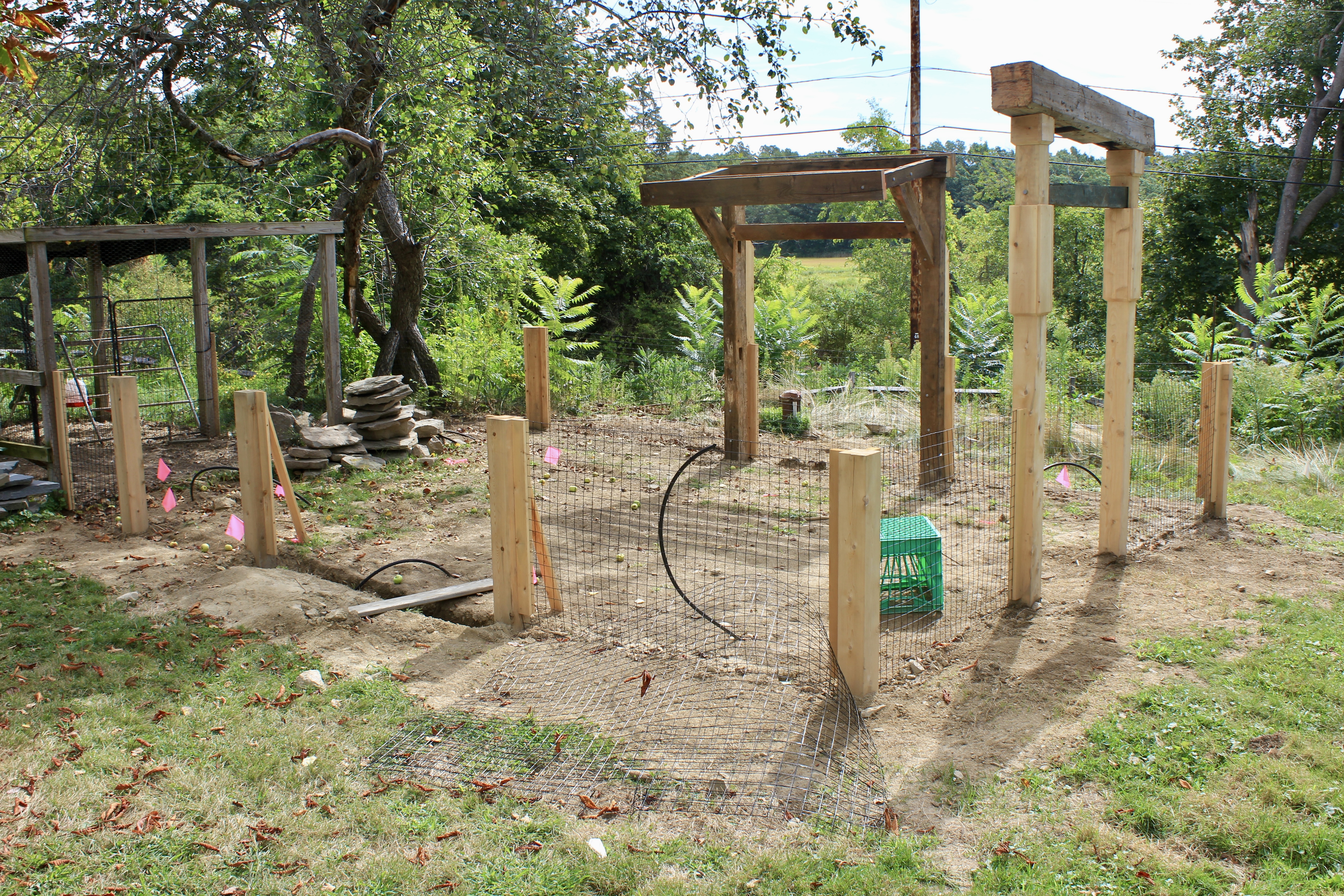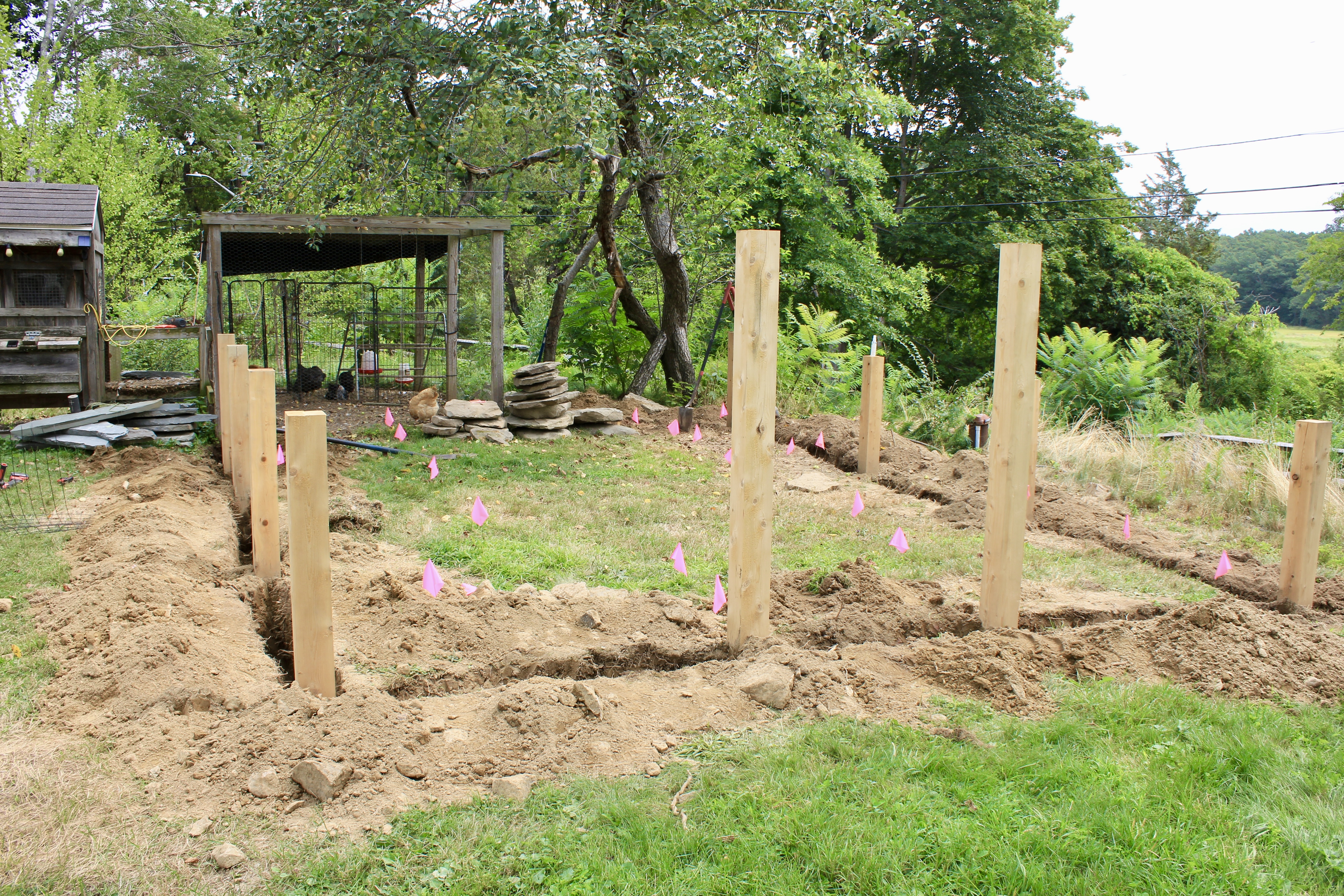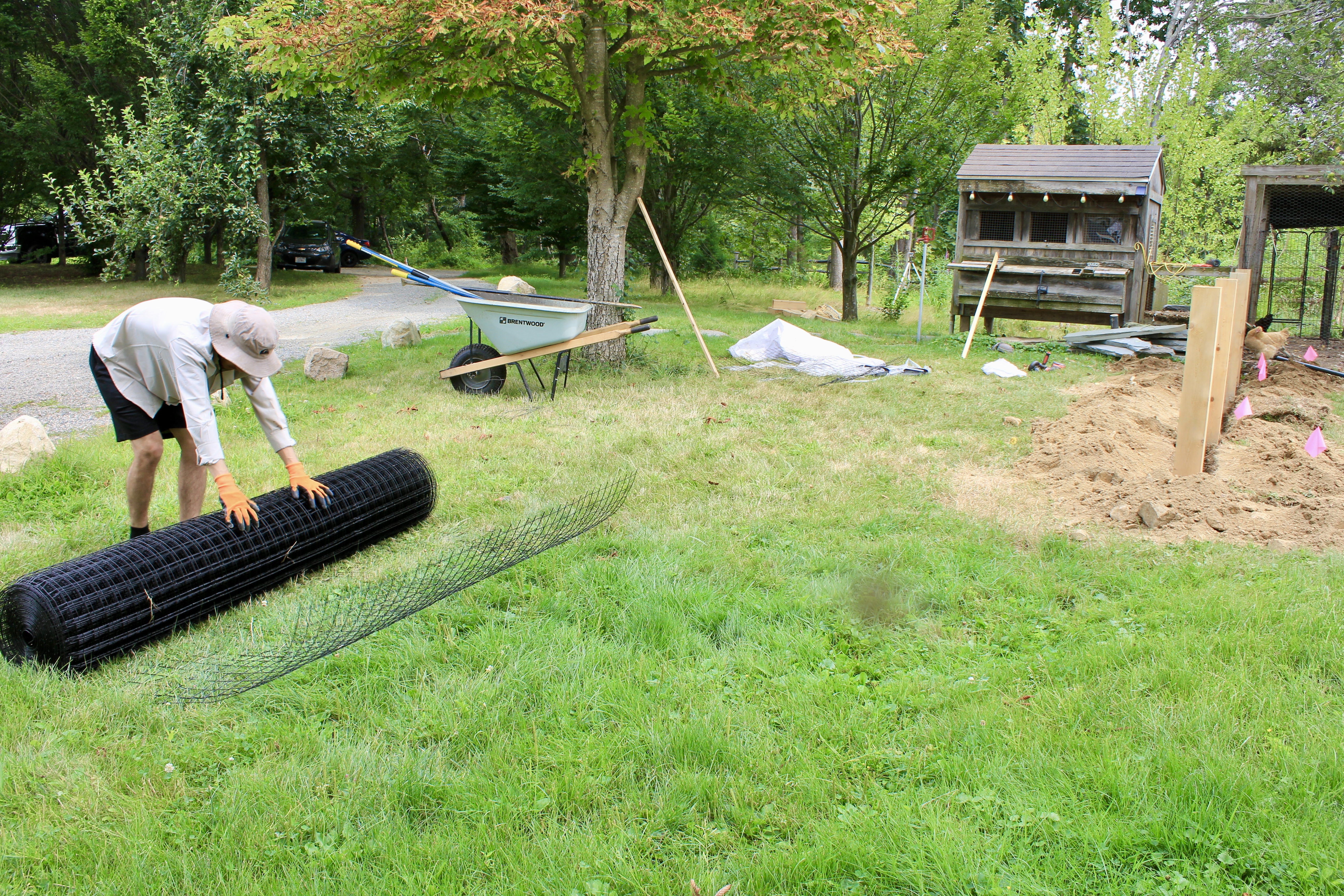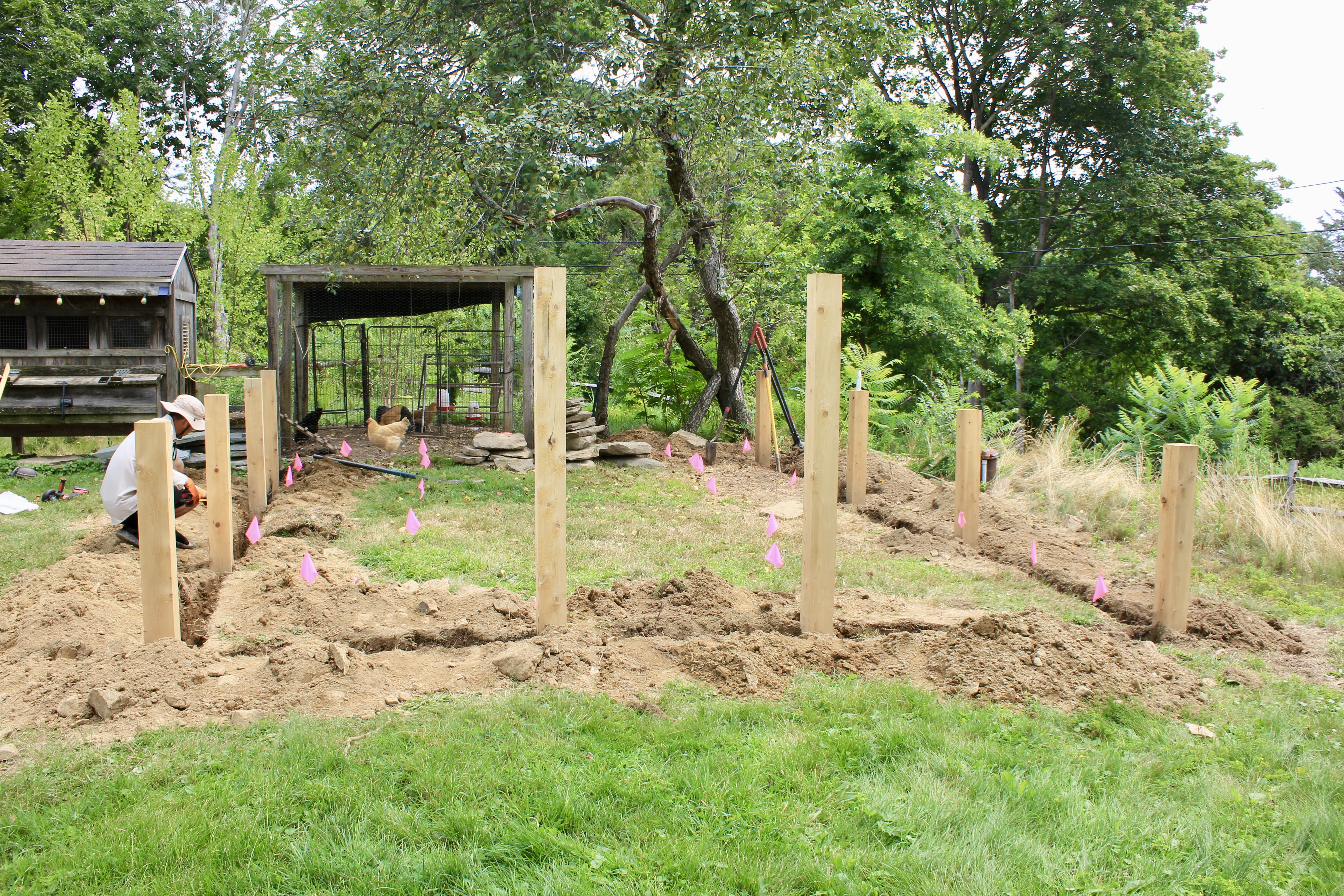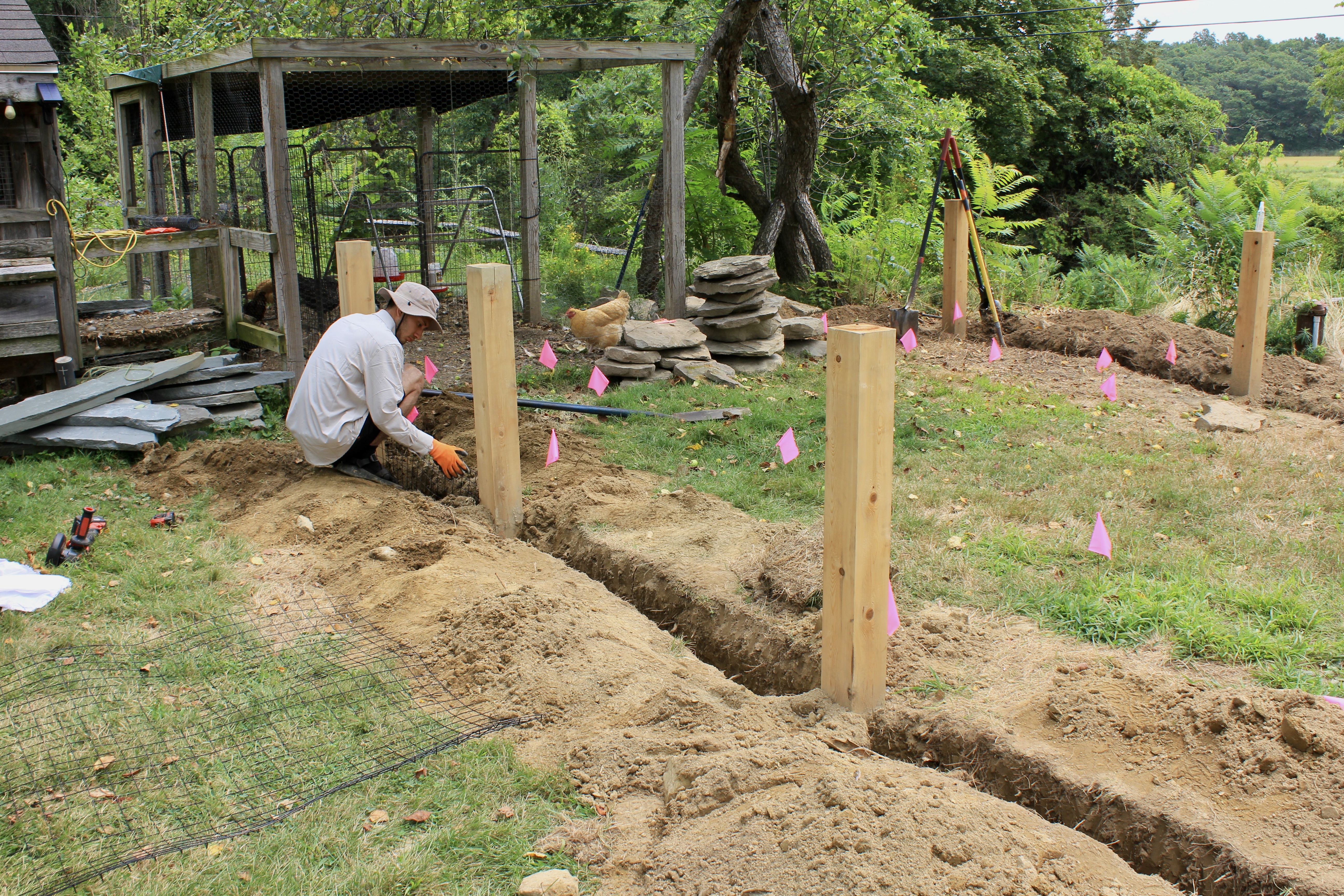 With the structure defined, we excavated a continuous three-foot trench along the fence line to properly bury the wire fencing below grade. This step is essential in vegetable garden installations, creating a barrier that prevents animals from tunneling beneath while maintaining the garden’s clean, finished appearance above ground.