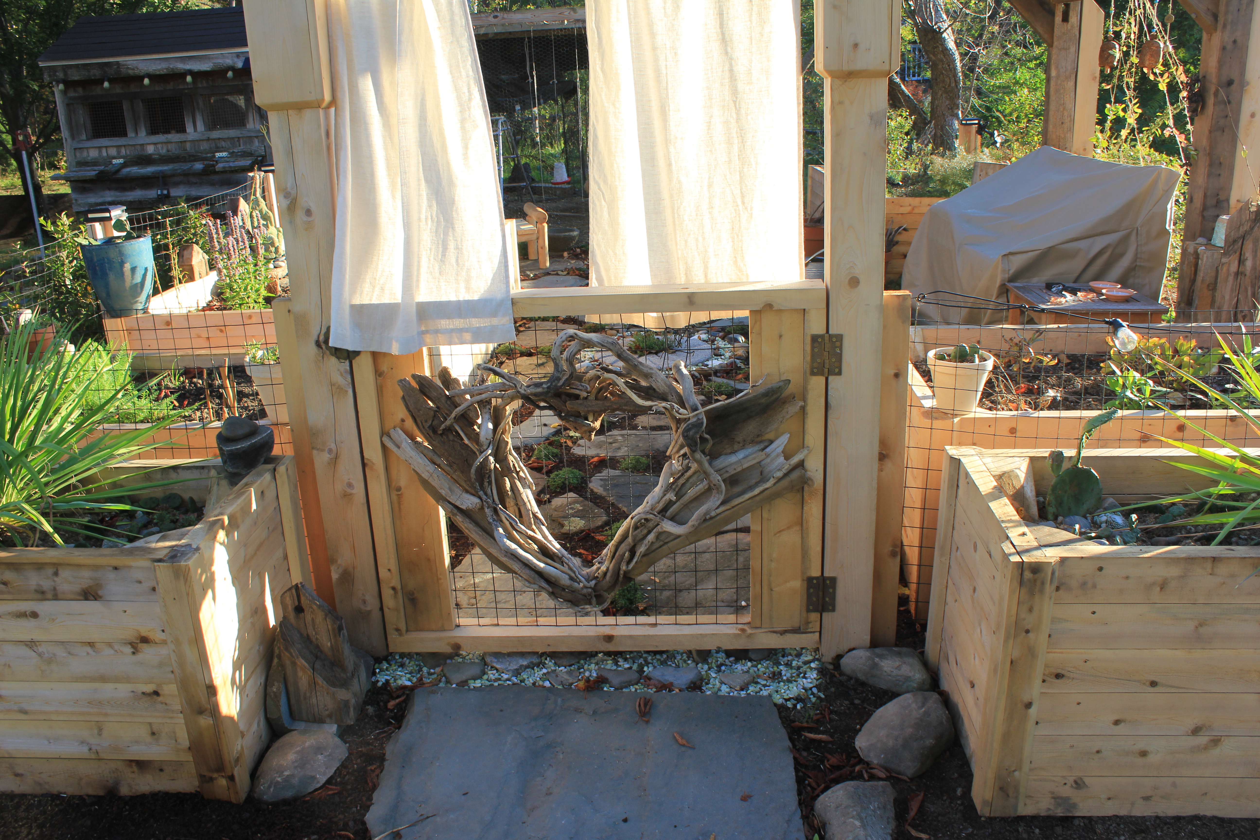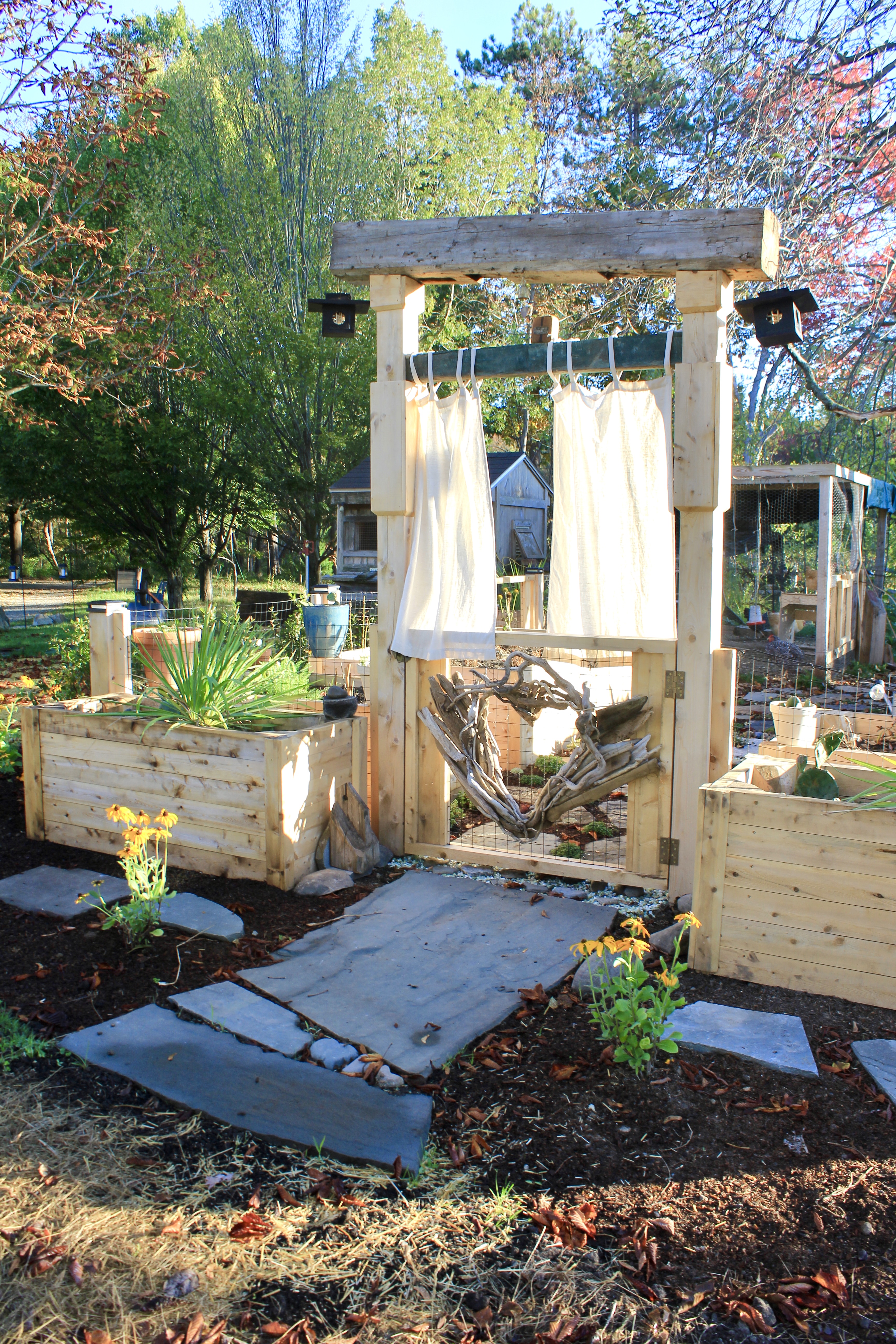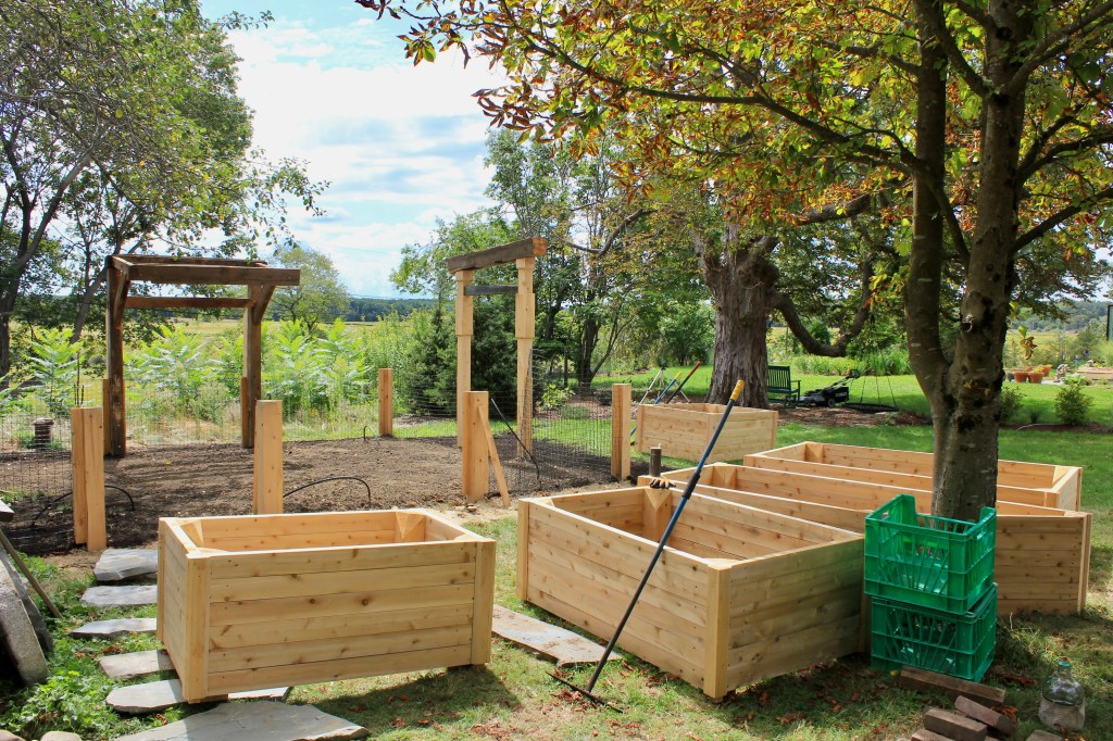 The raised garden boxes were custom built from white cedar, selected for its natural resistance to rot and longevity in outdoor environments. Using untreated wood ensured the beds remain safe for growing food while allowing the material to weather naturally over time. The clean lines and warm tone of the cedar complement the surrounding fencing and barn wood details, tying the raised beds seamlessly into the overall garden aesthetic.