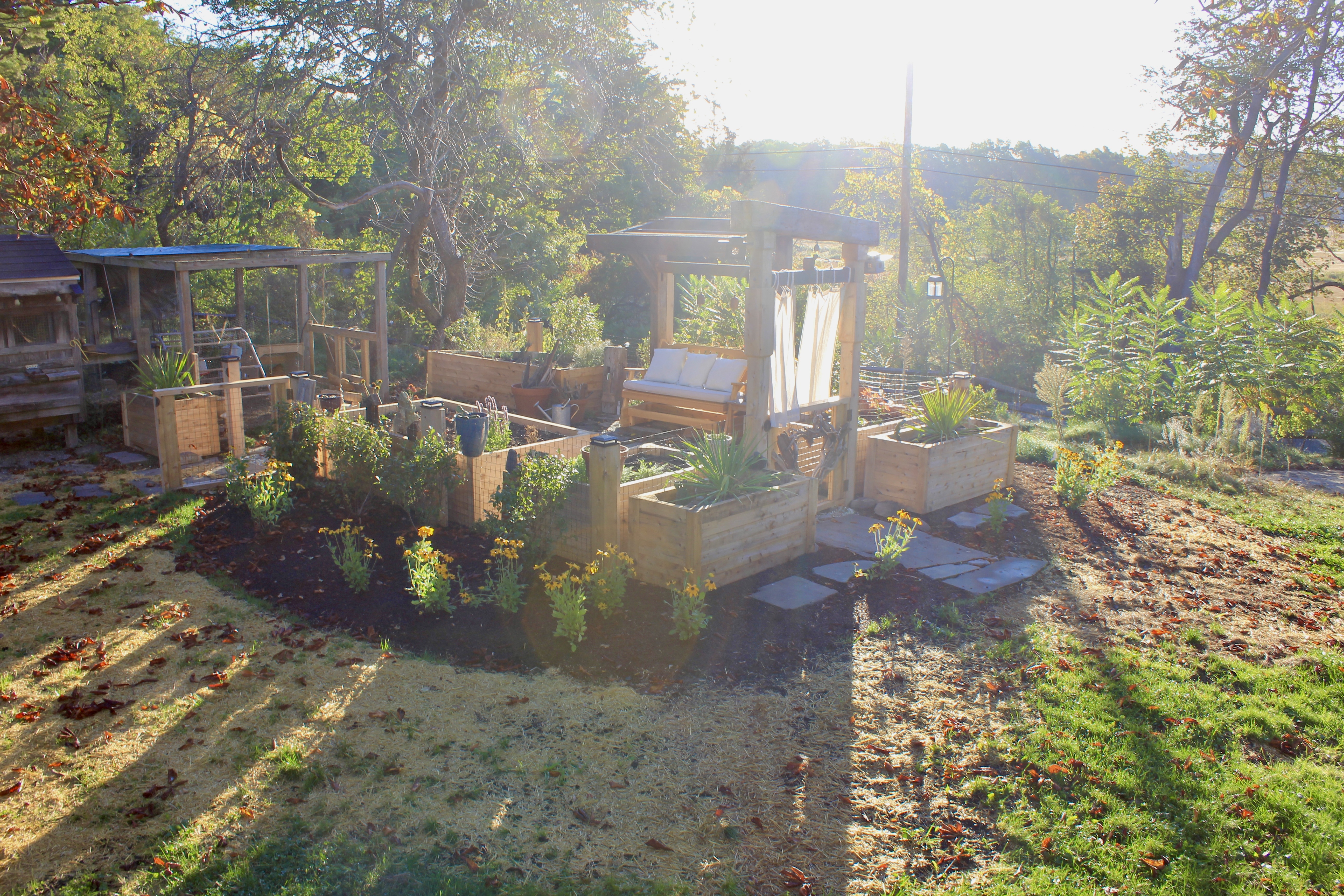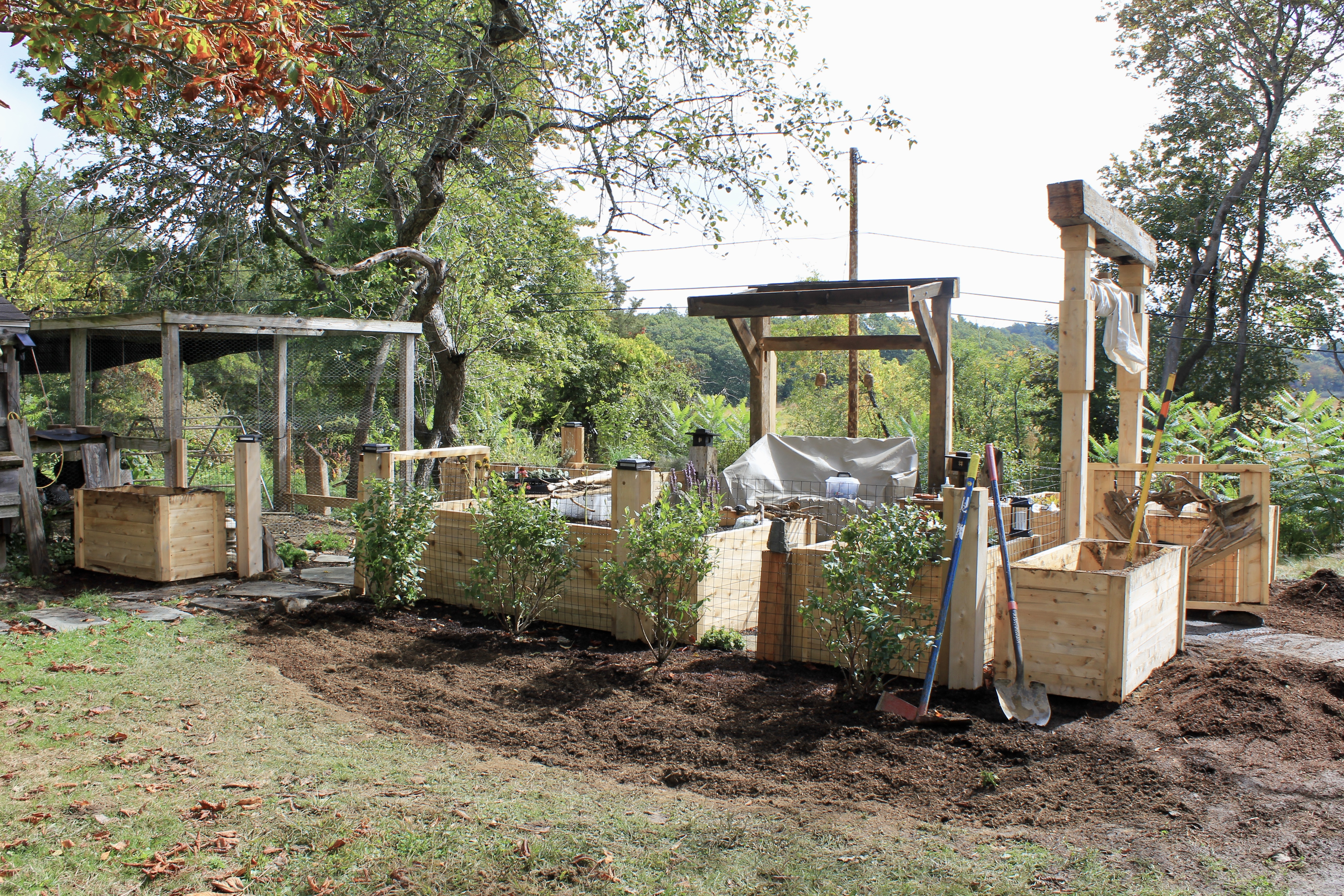 Along the outside perimeter of the fence, blueberry bushes were planted to create an edible border, complemented by yarrow, black-eyed Susan, and other beneficial plants chosen to support pollinators and reinforce a permaculture-focused garden system.